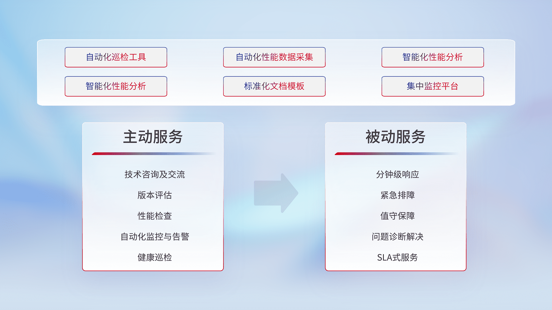 智能化工具和标准化文档,,,,保障服务质量,,,提供主动服务(包含技术咨询、、版本评估、、性能检查、、、自动化监控与告警、、、健康巡检)和被动服务包含(分钟级响应、、、、紧急排障、、、、值守保障、、、问题诊断解决、、、SLA服务)。。。。